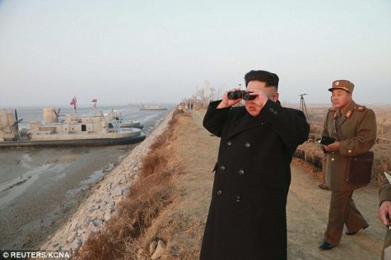金正恩持望远镜远眺训练中的空气浮艇。(图片来源:朝中社)