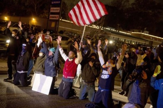 今年8月9日,18岁黑人青年迈克尔·布朗在密苏里州弗格森镇外一间便利店门前,被白人警察达伦·威尔逊枪杀,许多证人都表示,当时布朗手无寸铁。“布朗事件”最终引发“小石城事件”后美国最严重的种族分歧和冲突,示威者喊出“警察别开枪、我们投降”的口号语带讥讽。