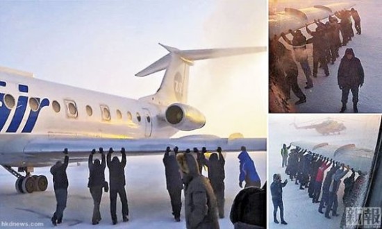乘客在摄氏零下52度的低温下协助推动飞机。