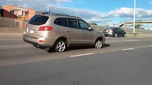 透过后方车辆的摄影镜头,可以看到前方的银色轿车摇摇晃晃、歪向一边,仔细一看,银色轿车的右方轮胎竟然都消失了。没了轮胎照样开,靠着轮圈高速前进,会不会太危险了?