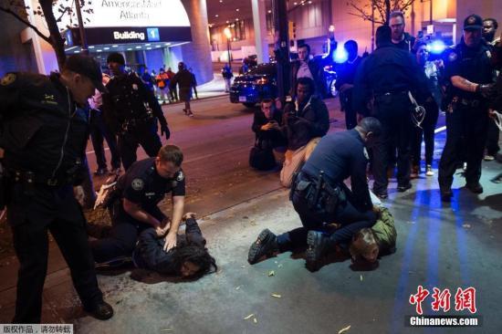 当地时间11月25日,因枪杀黑人青年免遭起诉的白人警察案件而引发的各地抗议和骚乱已经进入第二天,美国各地警方开始对示威者进行驱散和拘捕。图为亚特兰大警方拘捕抗议者。