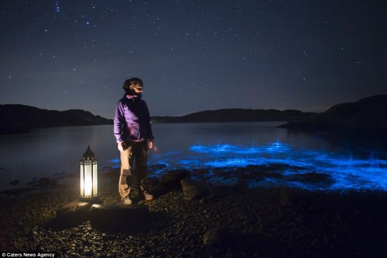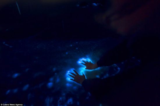 浮游生物、萤火虫和琵琶鱼等生物可以通过释放化学荧光素发光。摄影师将手放入水中,惊动了这些浮游生物,导致它们发光。(图片来源:《每日邮报》)