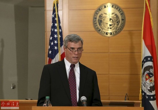 11月24日,在美国密苏里州圣路易斯市,检察官鲍勃·麦卡洛克宣布,弗格森镇枪杀黑人青年迈克尔·布朗的白人警官达伦·威尔逊被免于起诉。新华社/路透