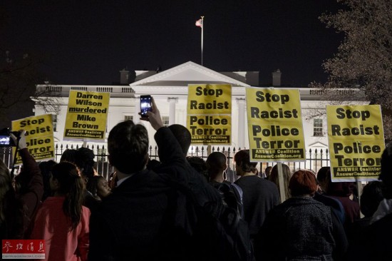 11月24日,人们聚集在美国首都华盛顿白宫前,抗议弗格森案裁定结果。美国密苏里州大陪审团24日宣布针对弗格森枪击案的裁定结果,枪杀黑人青年迈克尔·布朗的白人警察达伦·威尔逊被免于起诉。这一结果立刻引起弗格森民众强烈不满。24日晚,美国总统奥巴马在白宫发表讲话,呼吁民众在弗格森案宣判后保持冷静。就在奥巴马发表讲话之后,白宫前聚集了百余民众,抗议裁定结果。新华社记者鲍丹丹摄