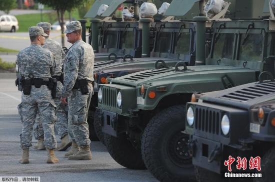 资料图:当地时间2014年8月18日,美国弗格森,国民警卫队成员在当地巡逻。