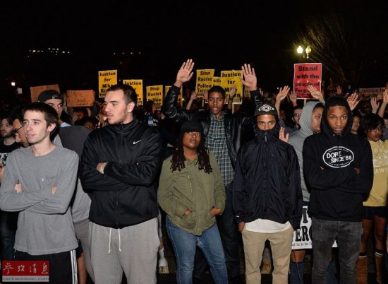弗格森案的大陪审团在听取60位证人的证词之后,决定不起诉开枪打死黑人布朗的白人警察。证词中,有不止一位法医的证明,说是警察并未从背后开枪。但是,这两天弗格森案示威者,做出最戏剧的示威动作,高举双手,表示同情布朗已经举双手投降,而警察还对他开枪。