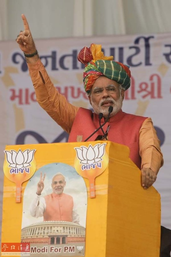 5月26日,印度总理府将迎来一位街头商贩出身的新主人——纳伦德拉·莫迪。这是4月28日,在印度古吉拉特邦阿南德,印度人民党总理候选人、古吉拉特邦首席部长纳伦德拉·莫迪发表竞选演讲。新华社记者郑焕松摄