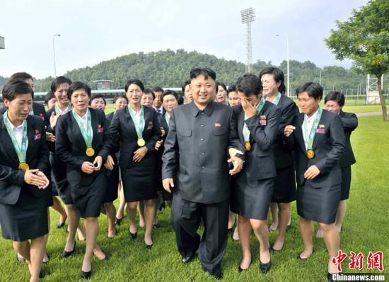 资料图:当地时间2013年8月1日,朝鲜领导人金正恩十分关注朝鲜足球发展,不仅在现场观看朝鲜男足比赛,还亲切接见在东亚杯女足赛中获得冠军的朝鲜女子足球队。图片来源:东方IC 版权作品 请勿转载