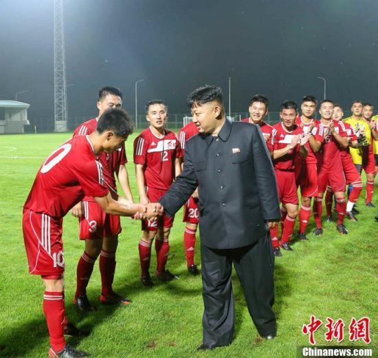 资料图:当地时间2013年8月1日,据朝鲜《劳动新闻》报道,朝鲜领导人金正恩十分关注朝鲜足球发展,不仅在现场观看朝鲜男足比赛,还亲切接见在东亚杯女足赛中获得冠军的朝鲜女子足球队。图为金正恩接见男足队员。图片来源:东方IC 版权作品 请勿转载
