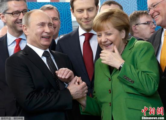 当地时间2013年4月8日,德国汉诺威,俄罗斯总统普京在参观汉诺威工业博览会期间,路过俄罗斯展位时,握住德国总理默克尔的手。