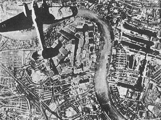 资料图片:德军轰炸机在伦敦工业区上空准备轰炸。(图片源于网络)