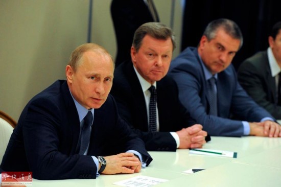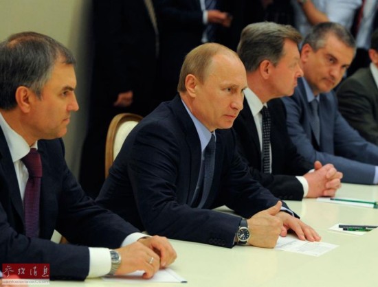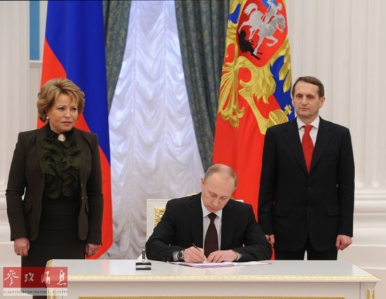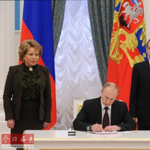 资料图片:俄罗斯总统普京在莫斯科克里姆林宫签署克里米亚入俄条约。新华社/美联
