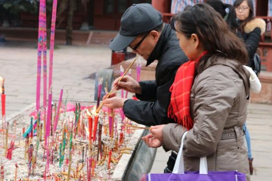 2014年12月22日,德阳文庙。四川德阳文庙始建于南宋,后存建筑为清代道光年间的格局,仅次于山东曲阜、北京的文庙。图为市民在文庙祈福。(摄影:刘梦阳)