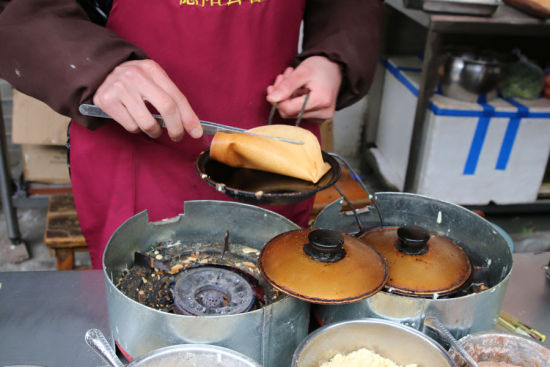 2014年12月22日,德阳文庙新天地步行街,正在制作当地小吃蛋烘糕的商贩。(摄影:刘梦阳)