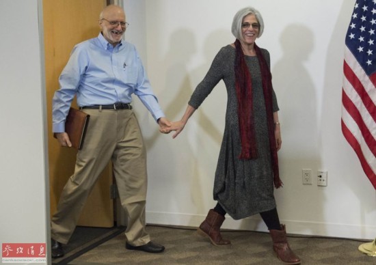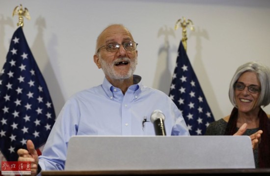 12月17日,在美国首都华盛顿,被古巴拘押5年已久的美国承包商艾伦·格罗斯获释,与妻子一起出席新闻发布会。