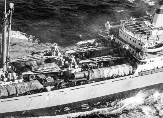 1962年古巴导弹危机期间,美军飞机和舰艇严密监视运送导弹的苏联货船。