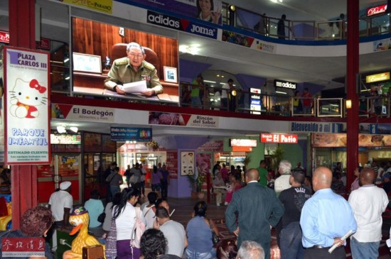 劳尔·卡斯特罗17日发表电视讲话说,他与奥巴马于16日通了电话,双方同意在国际法、联合国宪章的框架下,为早日达成双边关系正常化而采取一致措施。劳尔·卡斯特罗强调,美国必须解除对古巴长达半个多世纪的经济、金融和贸易封锁。他表示,尽管两国存在很多根本性差异,但古巴愿与美国进行合作和探讨,“我们应当学会承认差异,文明共处”。图为12月17日,古巴人在首都哈瓦那的街头观看劳尔·卡斯特罗发表电视讲话。新华社发