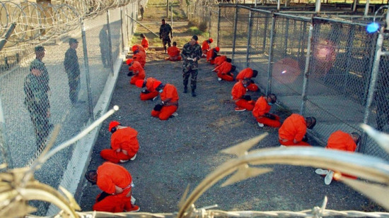 “9·11”事件后,美国在其控制的古巴关塔那摩基地关押了600多名俘虏,此举引发古巴方面强烈不满。图为美军在关塔那摩监狱关押的囚犯照片。