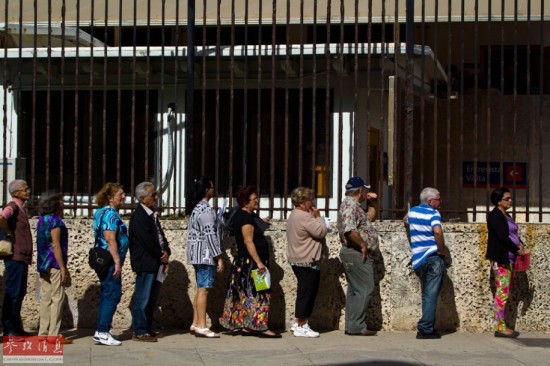 12月17日,古巴人在首都哈瓦那的美国驻古巴利益代表处排队办理领事业务。新华社记者刘彬摄