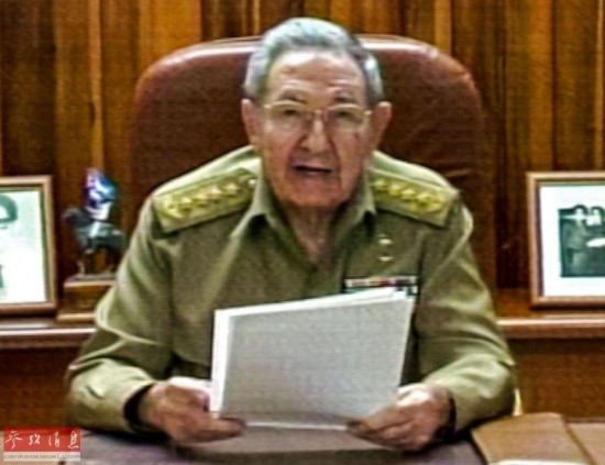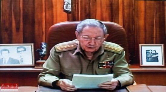 这是12月17日在古巴首都哈瓦那拍摄的劳尔·卡斯特罗发表电视讲话的截图画面。新华社记者刘彬摄