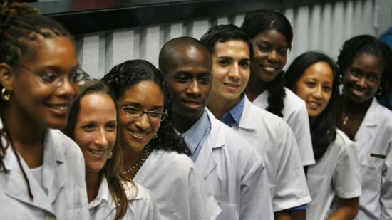 当然,美古两国关系并非只有剑拔弩张与横眉冷目。尽管被美国封锁多年,但古巴通过自身努力,医学和医疗体系发展到世界先进水平。图为2007年7月24日,8名获得古巴免费资助的美国年轻人经过6年学习,从古巴医学院毕业。