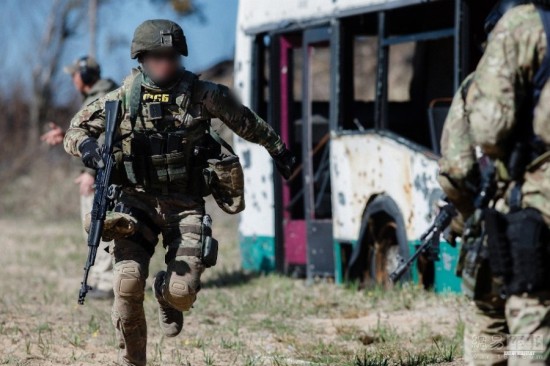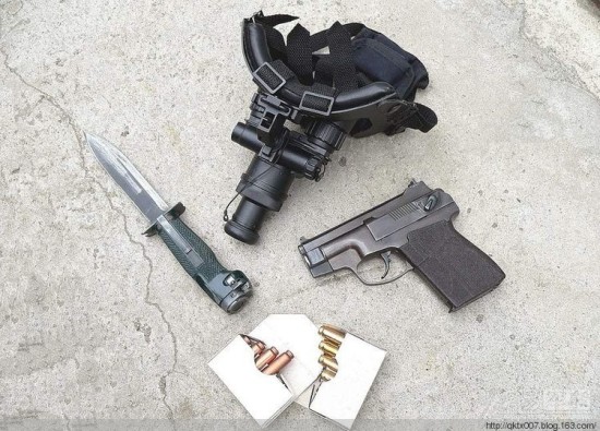 俄军特种部队装备有可发射9毫米强装穿甲弹的GSh-18,枪口附近枪管上的闭锁凸笋和“地包天”的套筒座是其显著特征的GSh-18手枪。以及KS-23霰弹枪,PP-19“野牛”冲锋枪,AK-74M突击步枪,SR-3“旋风”(Vikhr),加装了消声器、前握把、战术手电、红点镜、备用弹匣包。K6-3/K6-3A重型防弹头盔,斯捷奇金APS冲锋手枪,PP-93冲锋枪,托卡列夫TT-33手枪等武器和护具。