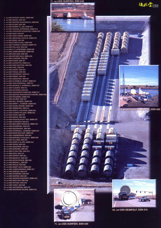 档案9:拉菲特级弹道导弹核潜艇。处理废旧核潜艇,富裕的美国同行看起来干得比俄国人强:他们正在切下这些图中这些退役拉菲特级的反应堆舱段。在卸载核武器、取出反应堆后,这些曾经的威慑武器就和普通废铁没有两样。