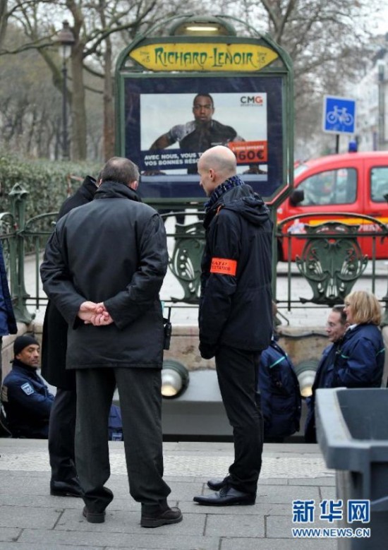 1月7日,在法国巴黎,距离袭击现场最近的地铁车站已经关闭,列车甩站通过。位于法国巴黎的《沙尔利周刊》总部7日遭到武装分子袭击,目前已造成12人死亡,另有多人受伤。法国总统奥朗德强烈谴责此次袭击。他在袭击现场说:“这无疑是一起恐怖袭击。”新华社记者陈晓伟摄