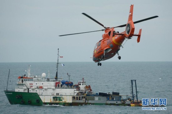 1月8日,在亚航失事客机坠毁海域,一架印尼搜救直升机飞过机尾残骸发现点。印度尼西亚官员8日说,搜救人员决定于9日打捞亚航失事客机机尾残骸,黑匣子是否仍在机尾处尚有待进一步确认。 新华社发