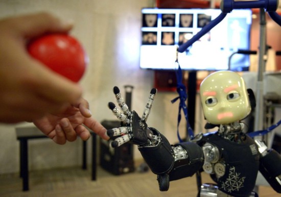 2014年11月18日,马德里的IEEE机器人及自动化分会类人机器人国际大会现场,类人机器人iCub与工作人员互动。iCub由意大利理工学院研制,是欧洲RobotCub项目的一部分,现已被世界各地的20多家实验室采用。这款机器人装有53个马达,用于移动头部、胳膊、双手、腕部和大腿。此外,它还装有视觉和听觉系统,具有本体感觉能力,同时还可以借助加速计和陀螺仪感知物体移动。
