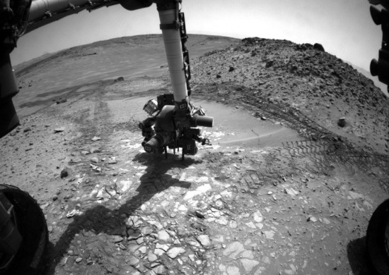 美国宇航局的“好奇”号火星车利用前部避险相机拍摄的一幅照片,展示了火星车的钻头。拍照时,“好奇”号正对一块名为“富矿之王”的火星岩石进行钻孔,以确定这片区域是否值得进行更深的钻孔取样。“好奇”号是迄今为止研制的最先进的火星车,旨在确定当前或者过去的火星是否存在适居环境。