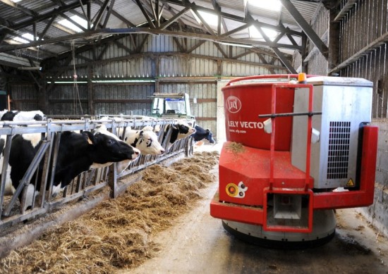 2014年2月18日,法国埃尔布雷的奶牛场,机器人正给霍斯坦种乳牛喂草。这种机器人售价14万欧元,虽然价格昂贵,但效果极佳,每头奶牛每天的产奶量平均提高了35公斤。