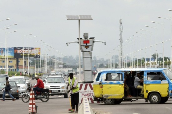2014年1月22日,刚果(金)金沙萨的一个交叉路口,机器人交警正在监视交通。机器人交警由金沙萨高级应用技术学院的工程师研制,装有4个摄像头,用于记录交通流量,随后将数据传输给指挥中心进行分析。