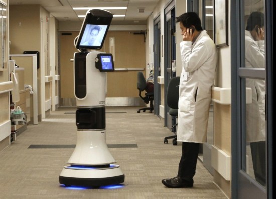 2013年11月6日,美国加利福尼亚州卡迈克尔的慈爱圣胡安医院,“慈爱远程医疗网”的医学部门负责人艾伦-沙特泽尔站在机器人RP-VITA旁打电话。RP-VITA能够将医生影像“传输”到医院,参与会诊和提出治疗方案。