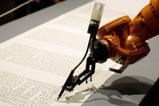 2014年7月10日,德国柏林的犹太博物馆,一个机器人正在书写《希伯莱圣经》。这个机器人借助钢笔和墨水书写,书写速度与人类相当。