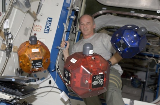 2014年7月3日,国际空间站的“命运”号实验舱,美国宇航局宇航员、第22远征队指挥官杰弗里-威廉斯正在检查SPHERES卫星。SPHERES是“同步位置的保持、连通与再定向试验卫星”的英文首字母缩写。