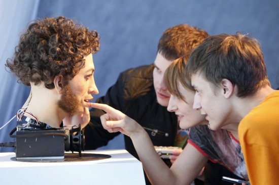 2014年5月17日,俄罗斯莫斯科的机器人展现场,参观者正仔细观察一件展品。