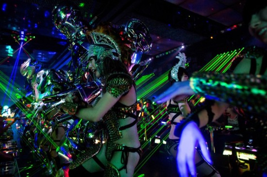2014年6月29日,东京红灯区歌舞伎町的机器人餐馆,巨型机器人和舞者正为客人们表演。机器人餐馆两年前创办,估计耗资1000万美元。餐馆的机器人每天表演三次,主要面向外国游客。