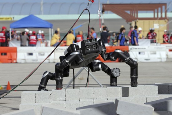 2013年的国际机器人挑战赛现场,卡内基-梅隆大学国家机器人工程中心的机器人CHIMP正在参加比赛。国际机器人挑战赛于12月20日至21日举行,由美国国防高级研究计划局组织,旨在推进用于应对自然和人为灾难的机器人的研制。