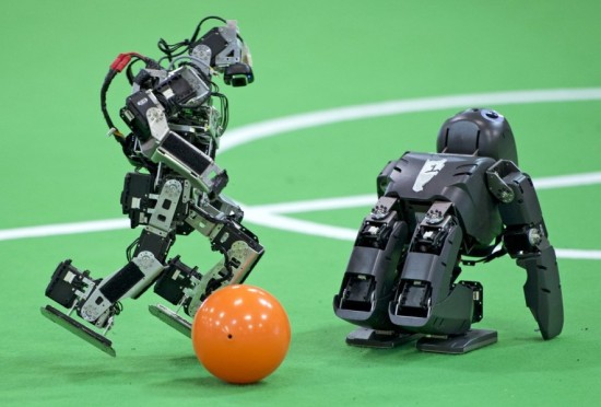 2014年4月3日,德国马格德堡的机器人世界杯比赛现场,德国队与英国队的比赛正处在进行时。机器人世界杯大联盟的44支球队参加本届世界杯,在足球、营救和舞蹈等比赛项目展开较量。