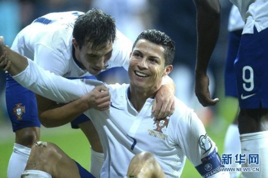 图为2014年10月14日,葡萄牙队球员C罗(中)在比赛中进球后与队友庆祝。当日,在哥本哈根举行的2016年欧洲足球锦标赛预选赛I组比赛中,葡萄牙队客场以1比0战胜丹麦队。新华社发