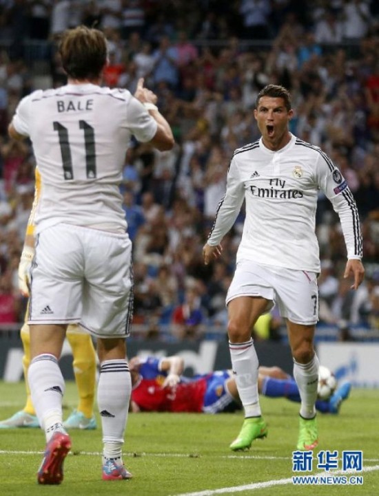 图为2014年9月16日,皇家马德里队球员C罗(右)和队友贝尔在比赛中庆祝进球。当日,在2014/2015赛季欧洲足球冠军联赛B组小组赛中,皇家马德里队主场以5比1战胜巴塞尔队。新华社发