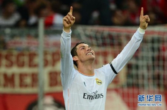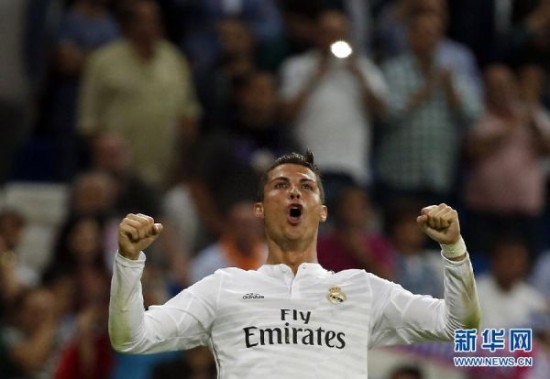 图为2014年9月23日,皇家马德里队球员C罗在比赛中庆祝进球。当日,在2014/2015赛季西甲联赛第5轮比赛中,皇家马德里队主场以5比1战胜埃尔切队。新华社发