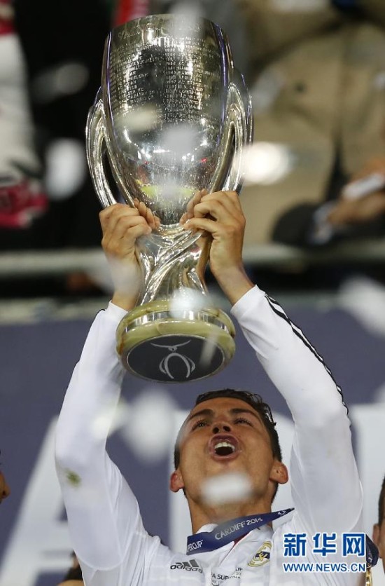 图为2014年8月12日,皇家马德里队球员C罗举起奖杯庆祝。当日,在英国加的夫城球场举行的2014欧洲超级杯赛中,上赛季欧冠联赛冠军、西甲皇家马德里队以2比0战胜上赛季欧罗巴联赛冠军、西甲塞维利亚队,赢得新赛季第一座冠军奖杯。新华社发