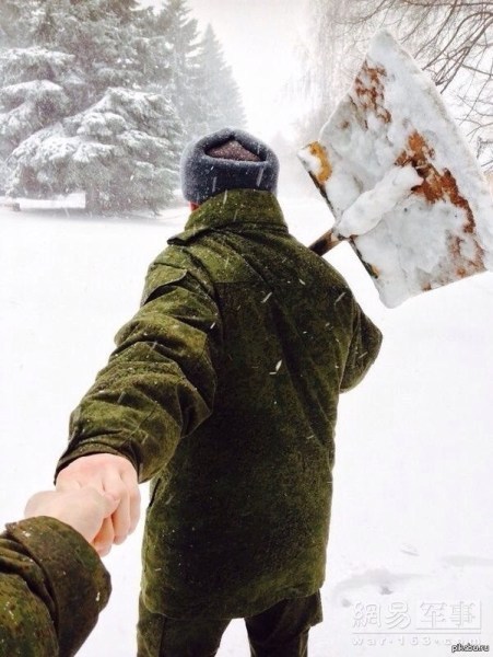 俄军扛着铲子。