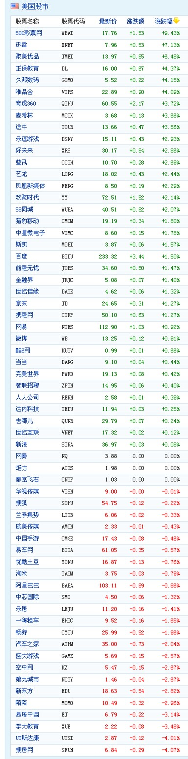 【延伸阅读】中概股周五收盘涨跌互现 500彩票网涨9%