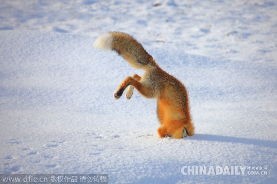 这是44岁的美国摄影师史蒂夫·欣奇拍摄到的一张非常滑稽的照片,照片中的狐狸为了寻找食物,高高跳起,以“倒栽葱”的姿势一下子栽进了雪里,头埋在雪中,尾巴直挺挺地向上立着。(图片来源:东方IC)