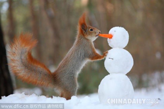 俄罗斯沃罗涅日地区,一只特别有才的红松鼠在森林里玩耍时用胡萝卜和雪球“堆起”了一个完美的雪人,它貌似对自己的作品相当满意。(图片来源:东方IC)
