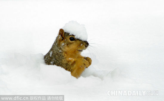 当地时间2014年2月5日,美国印第安纳州,一只可爱的小松鼠从雪地中探出头,四处张望,头上还顶着一个“雪帽”,十分滑稽。(图片来源:东方IC)