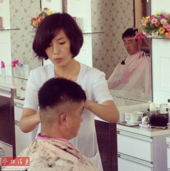 日常生活:一名男子在平壤的理发店理发。这类照片基本在全世界都能看到。